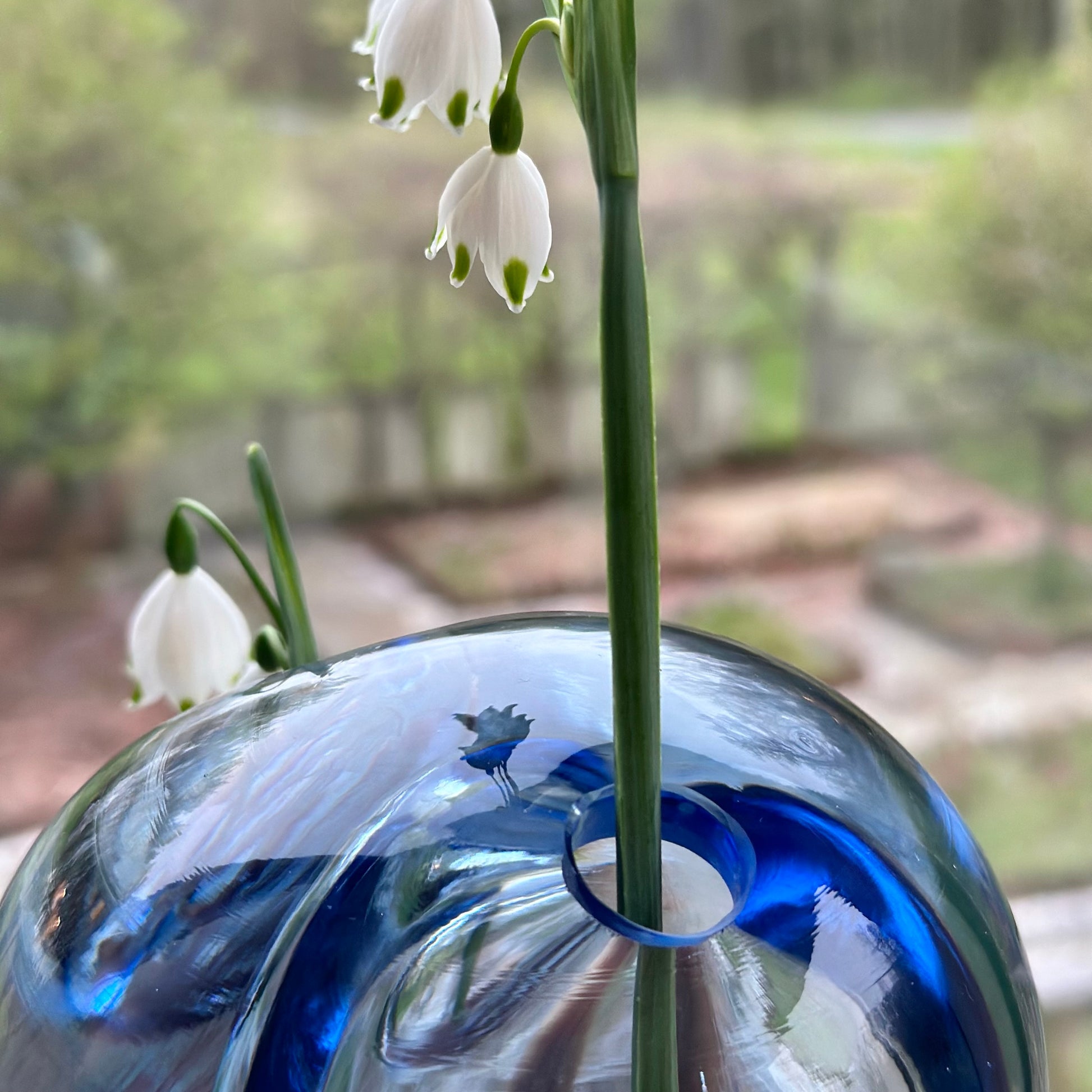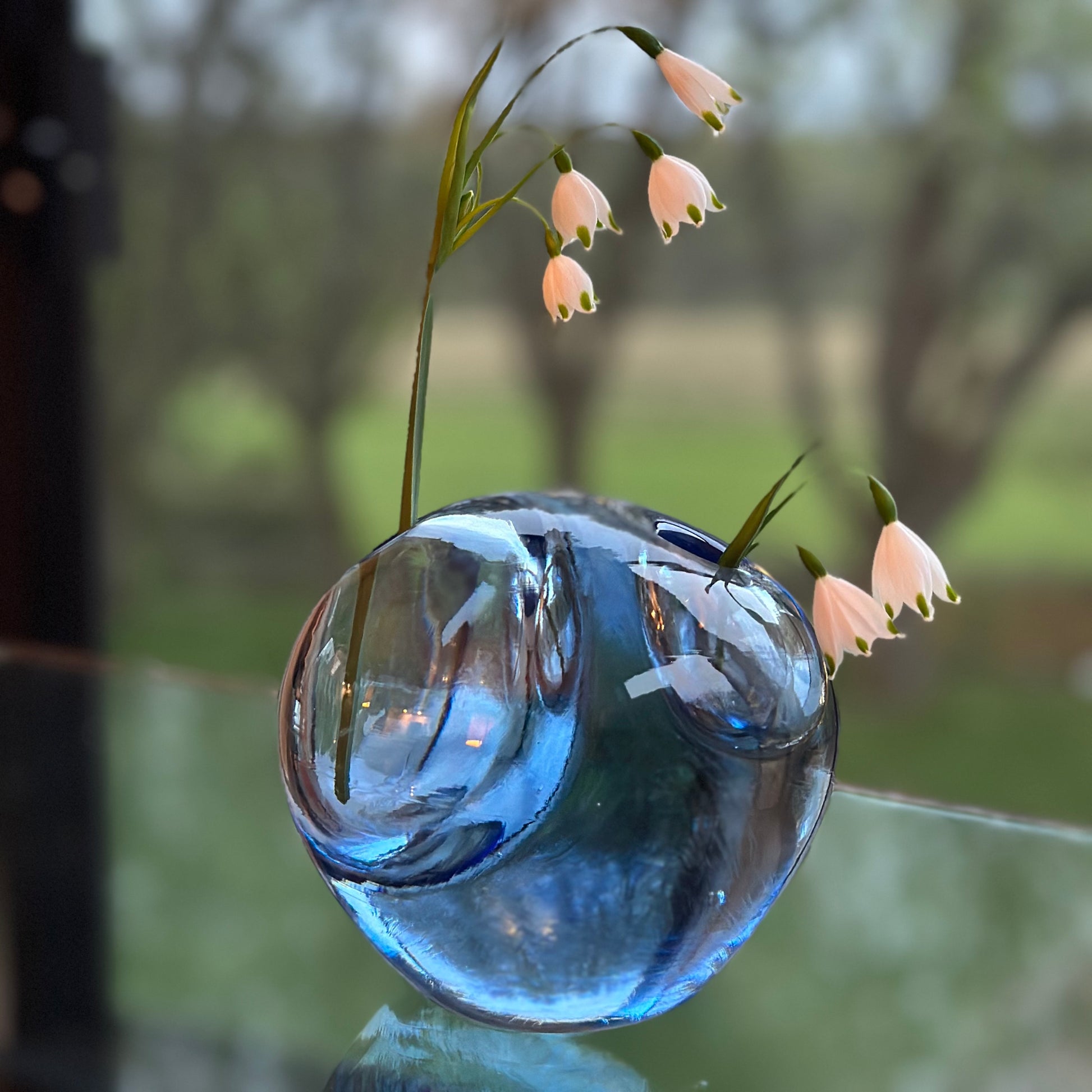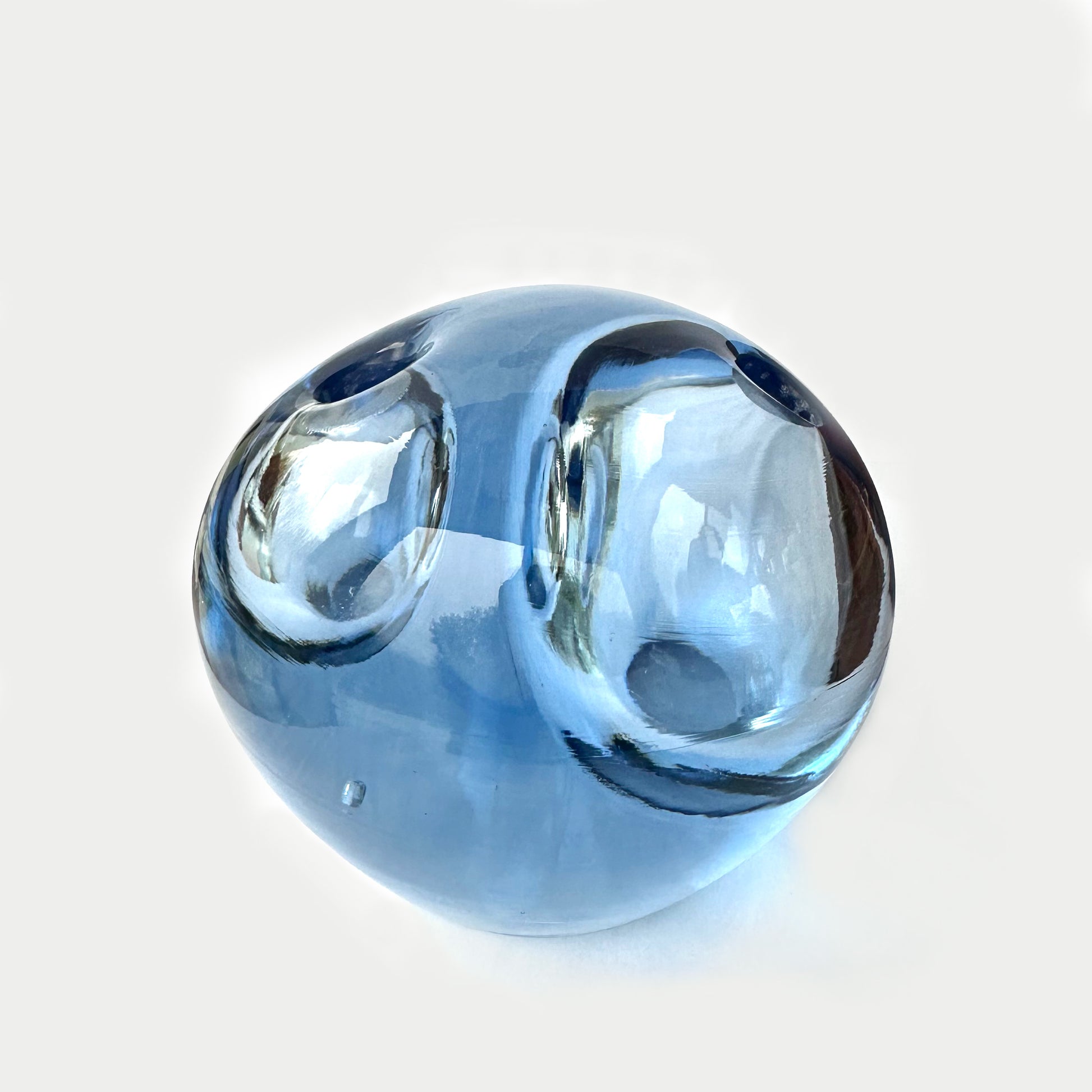 One of three in a limited edition of Sapphire Blue glass sprouting vases. Featuring the magical qualities of solid glass and two asymmetrical bubbles next to each other without touching, this objet d'art can serve as dual bud vase for sprouting plants of holding flowers, a paperweight or scrying orb.