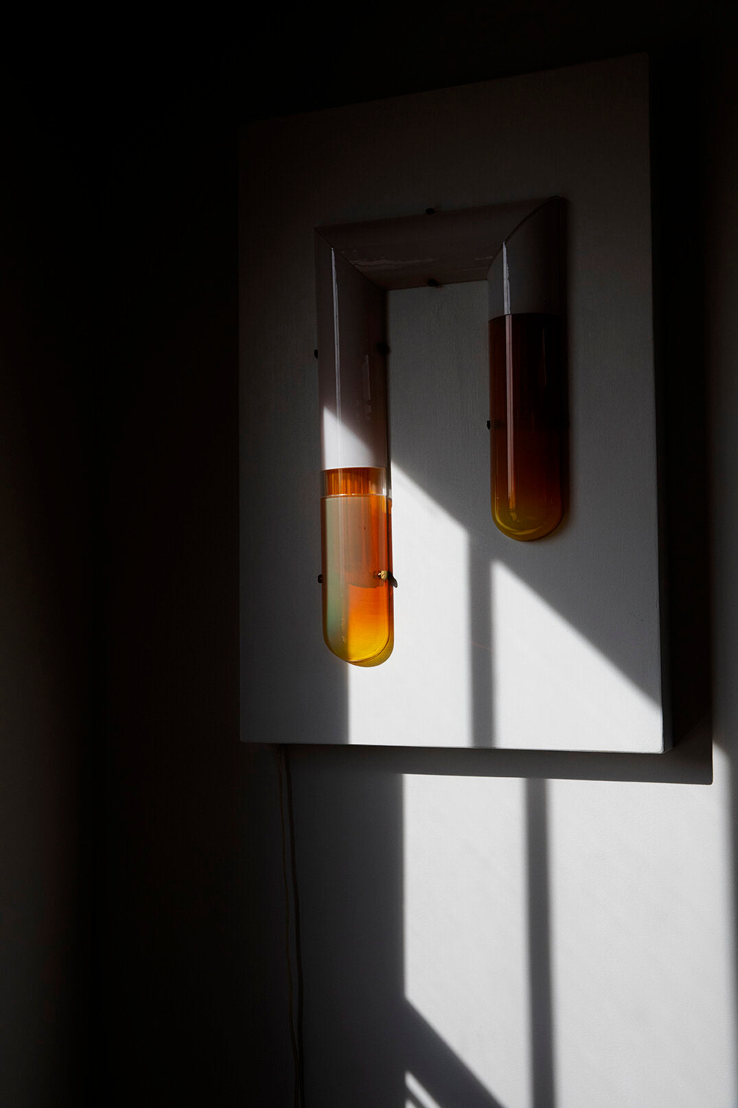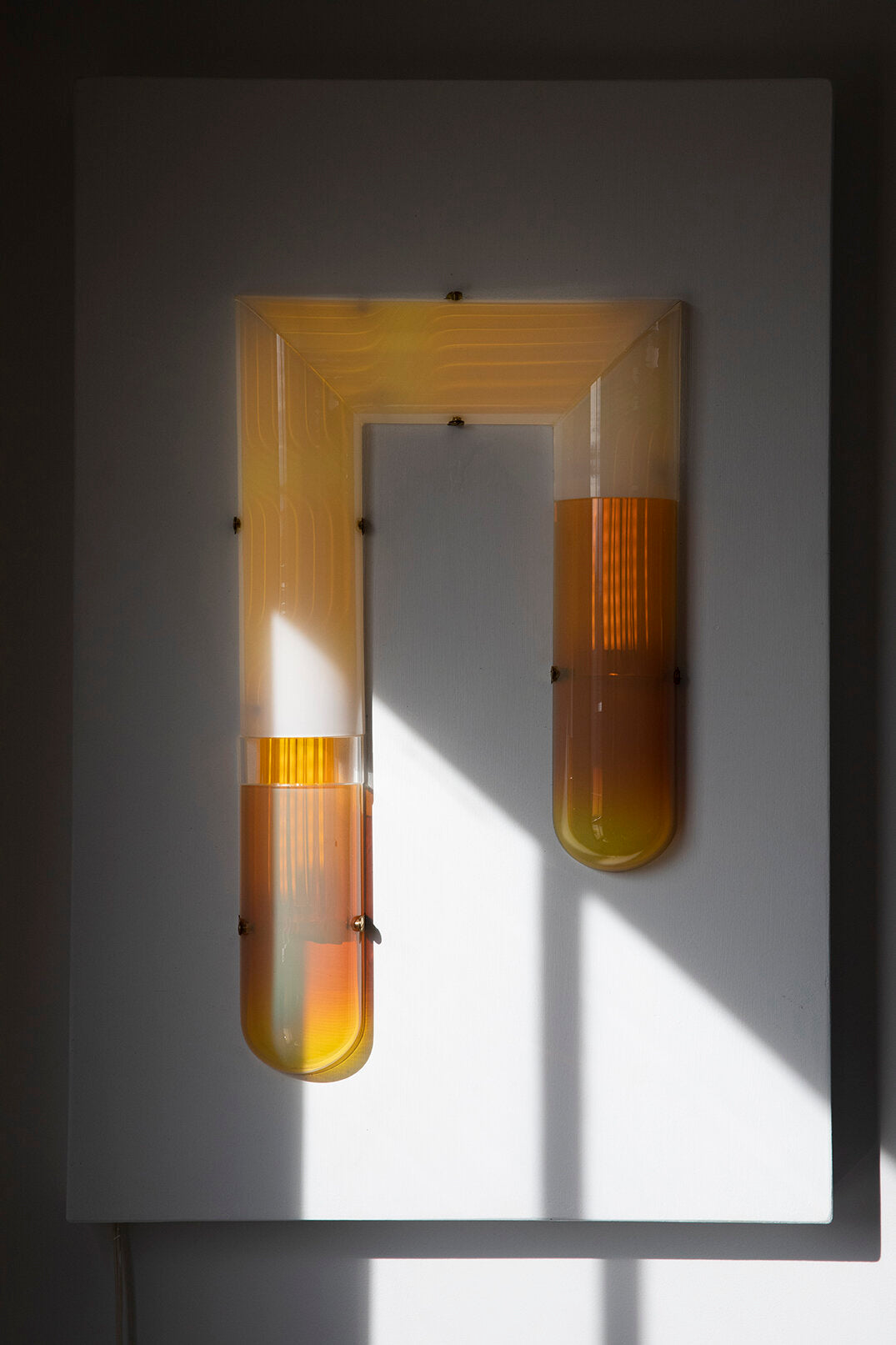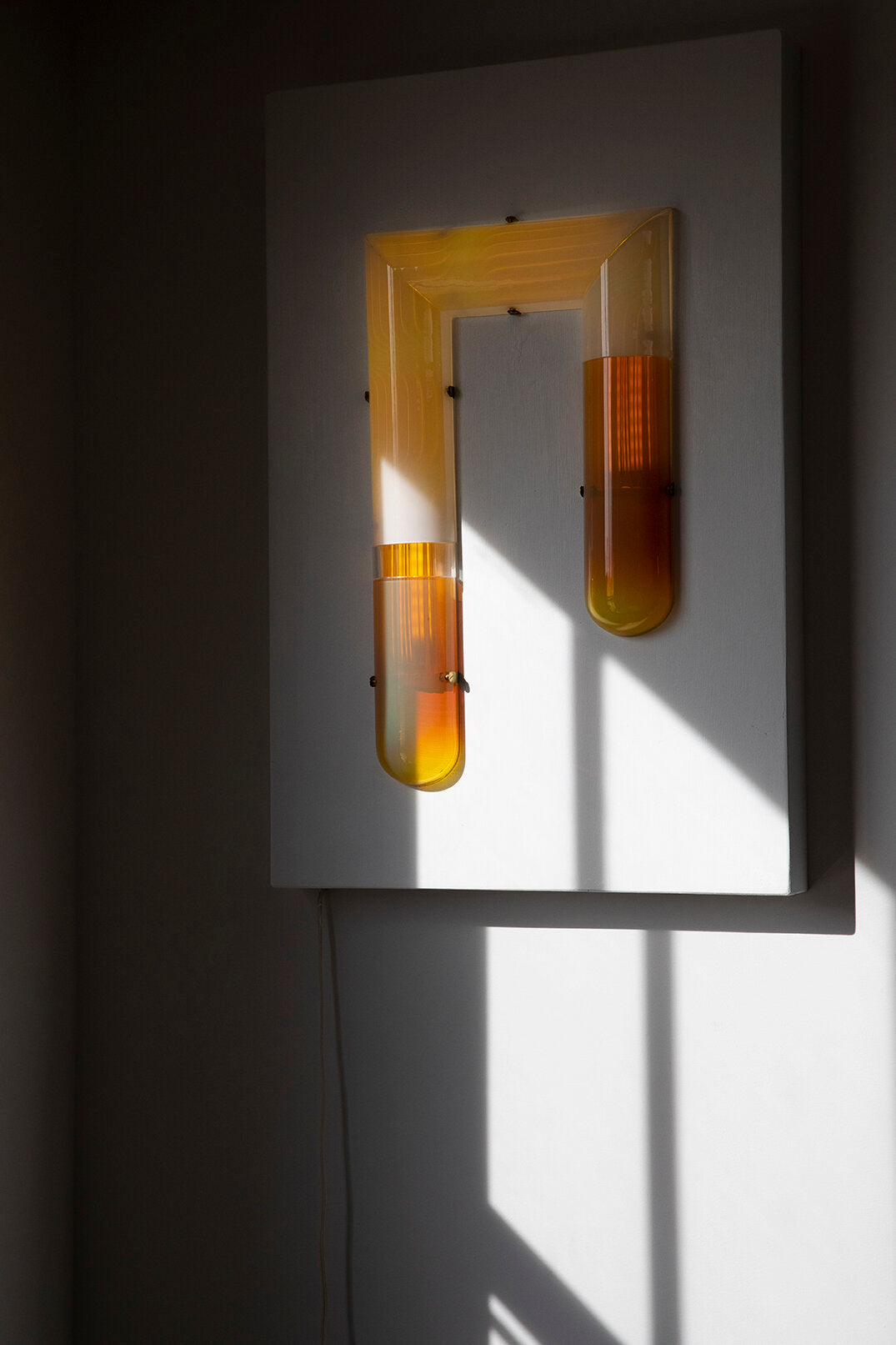 Material: vidrio soplado, latón, tiras de LED, acrílico, tablero de fibra de densidad media, látex, vinilo transparente de PVC