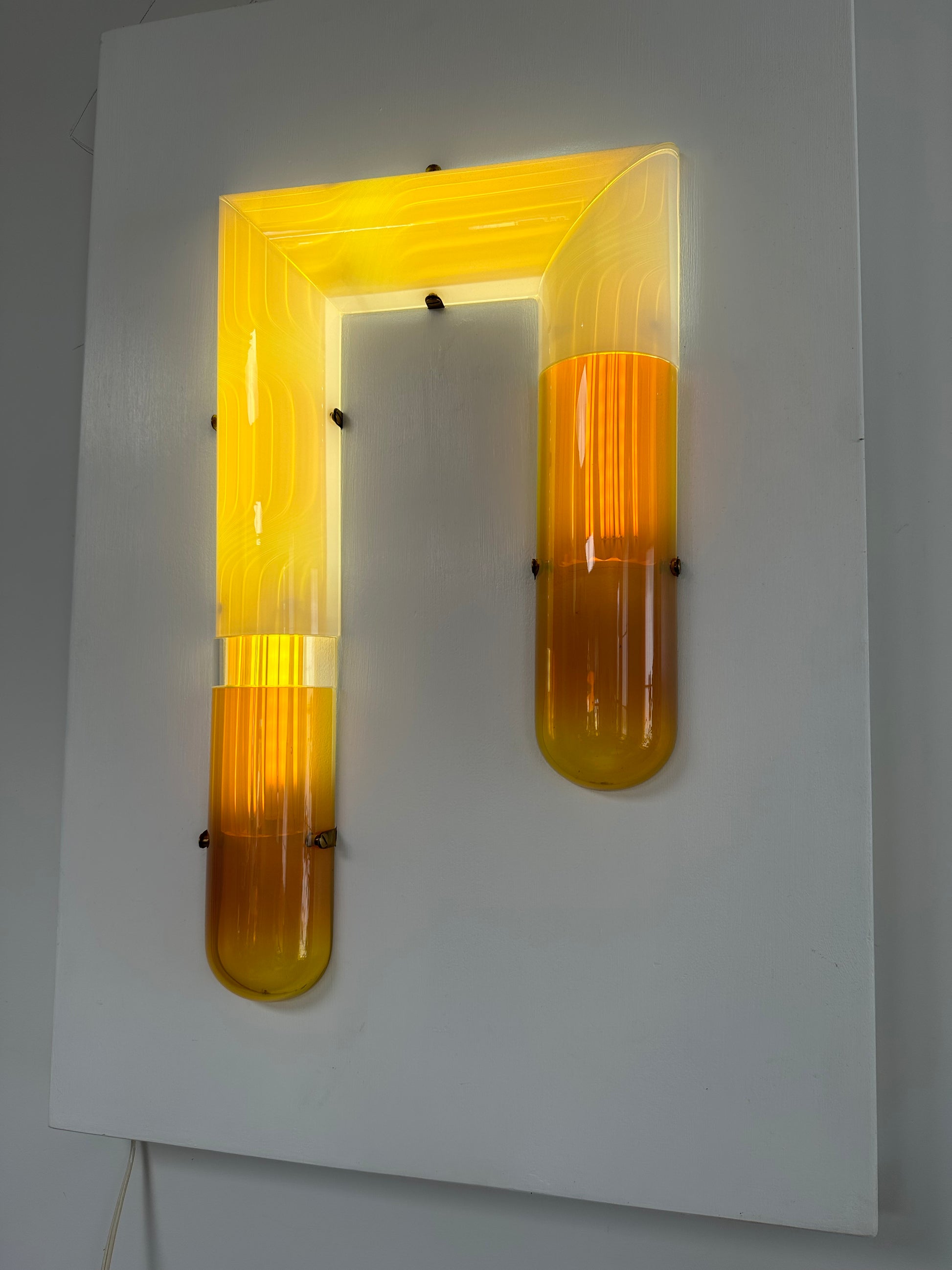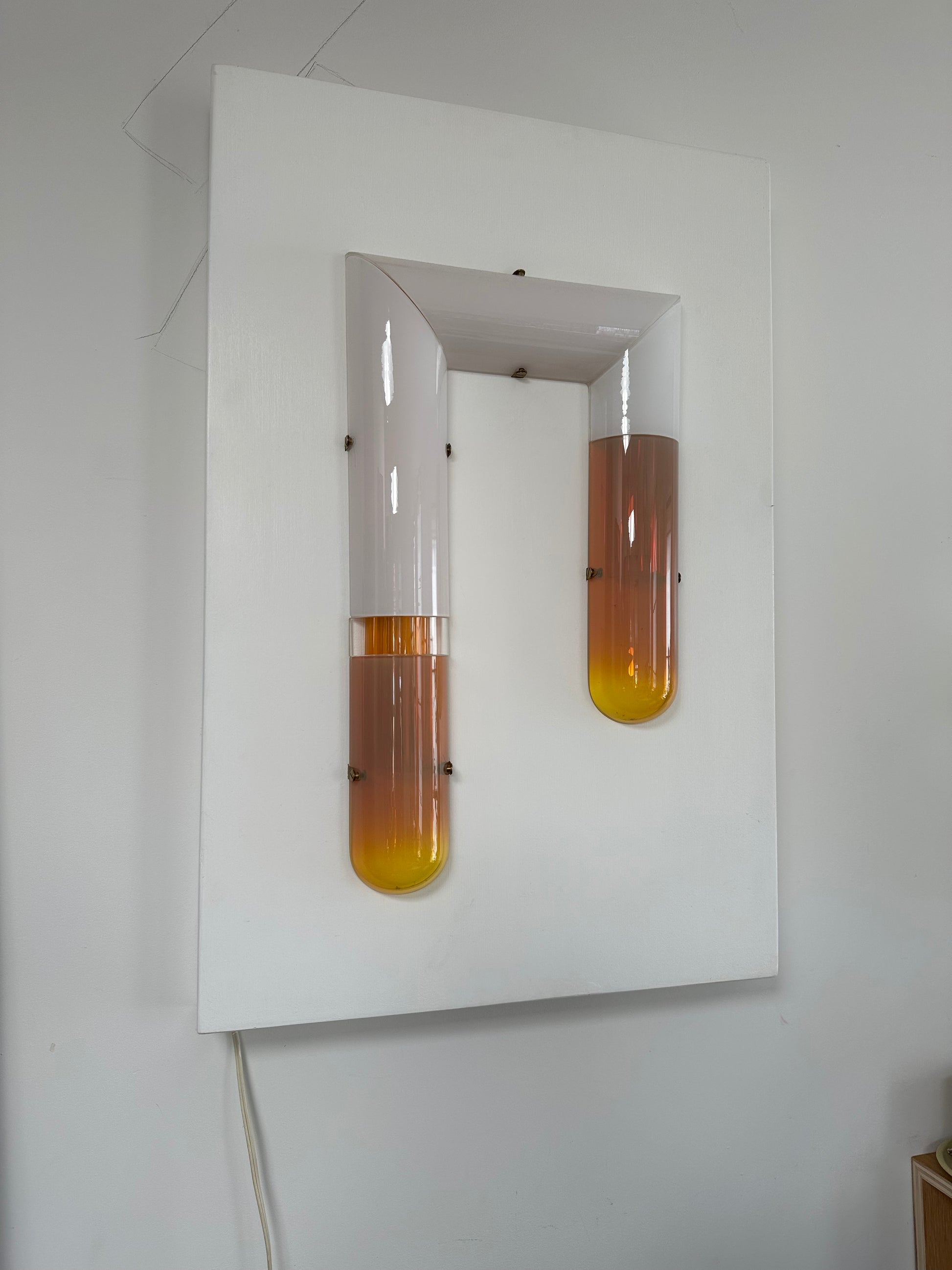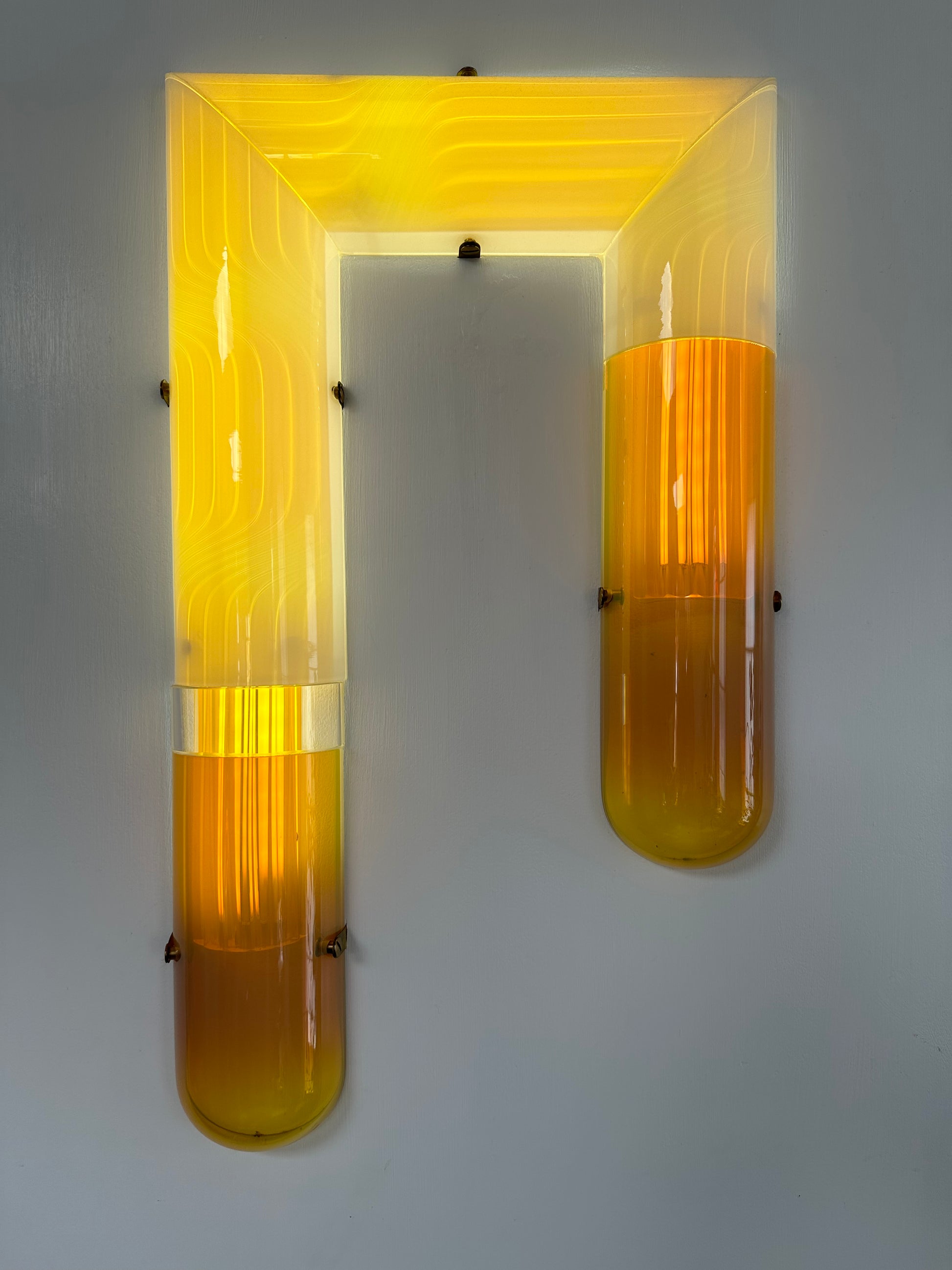 Material: vidrio soplado, latón, tiras de LED, acrílico, tablero de fibra de densidad media, látex, vinilo transparente de PVC