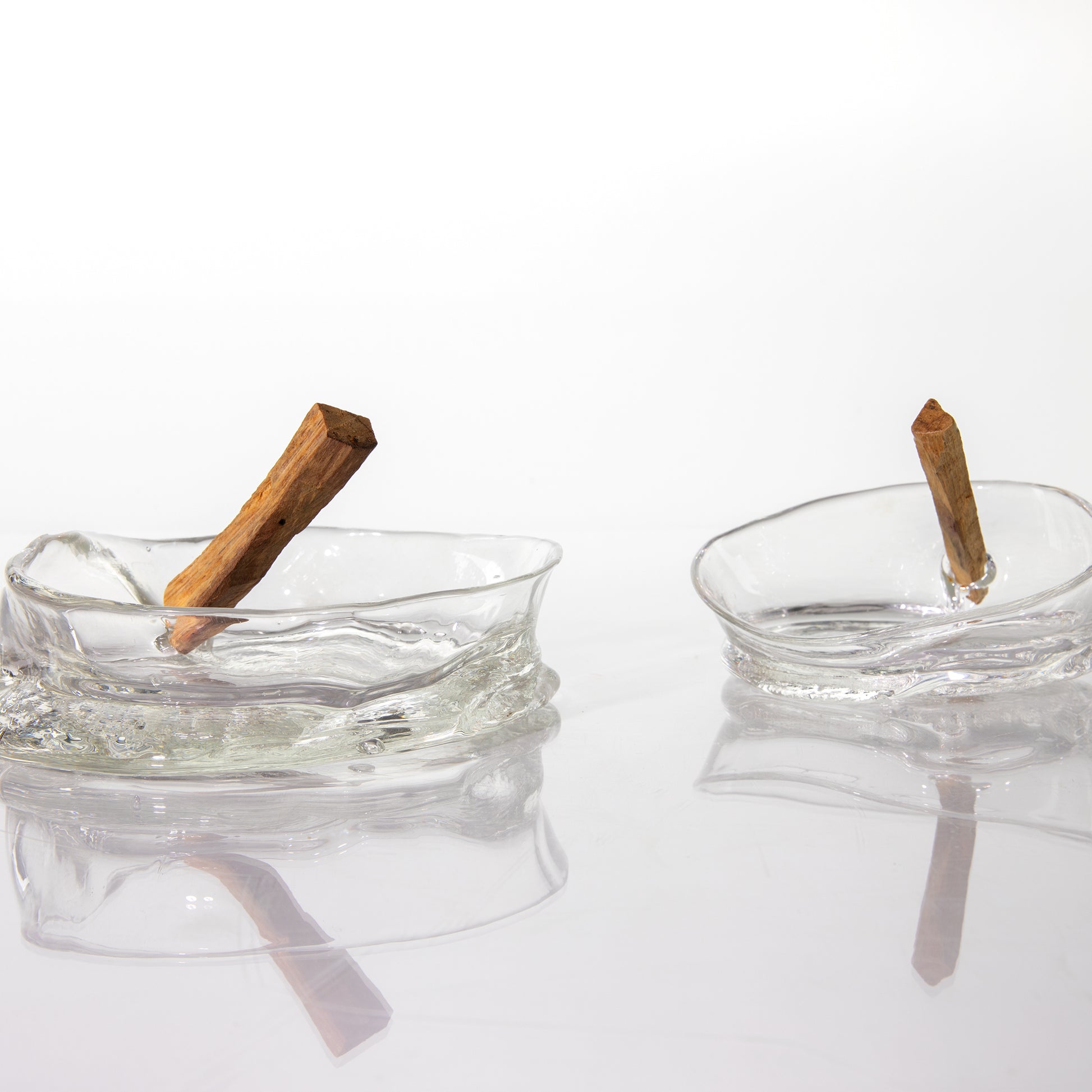 Los patrones de textura y superficie se crean introduciendo cambios elementales en el vidrio a medida que se transforma de líquido a sólido. Parecidos al flujo de energía en las formas vivas, estos recipientes iluminan su contenido y activan los espacios emitiendo sutiles movimientos de luz y sombra concentradas sobre la superficie en la que están colocados. Son recuerdos que provocan una expansión de la conciencia en y del momento presente.