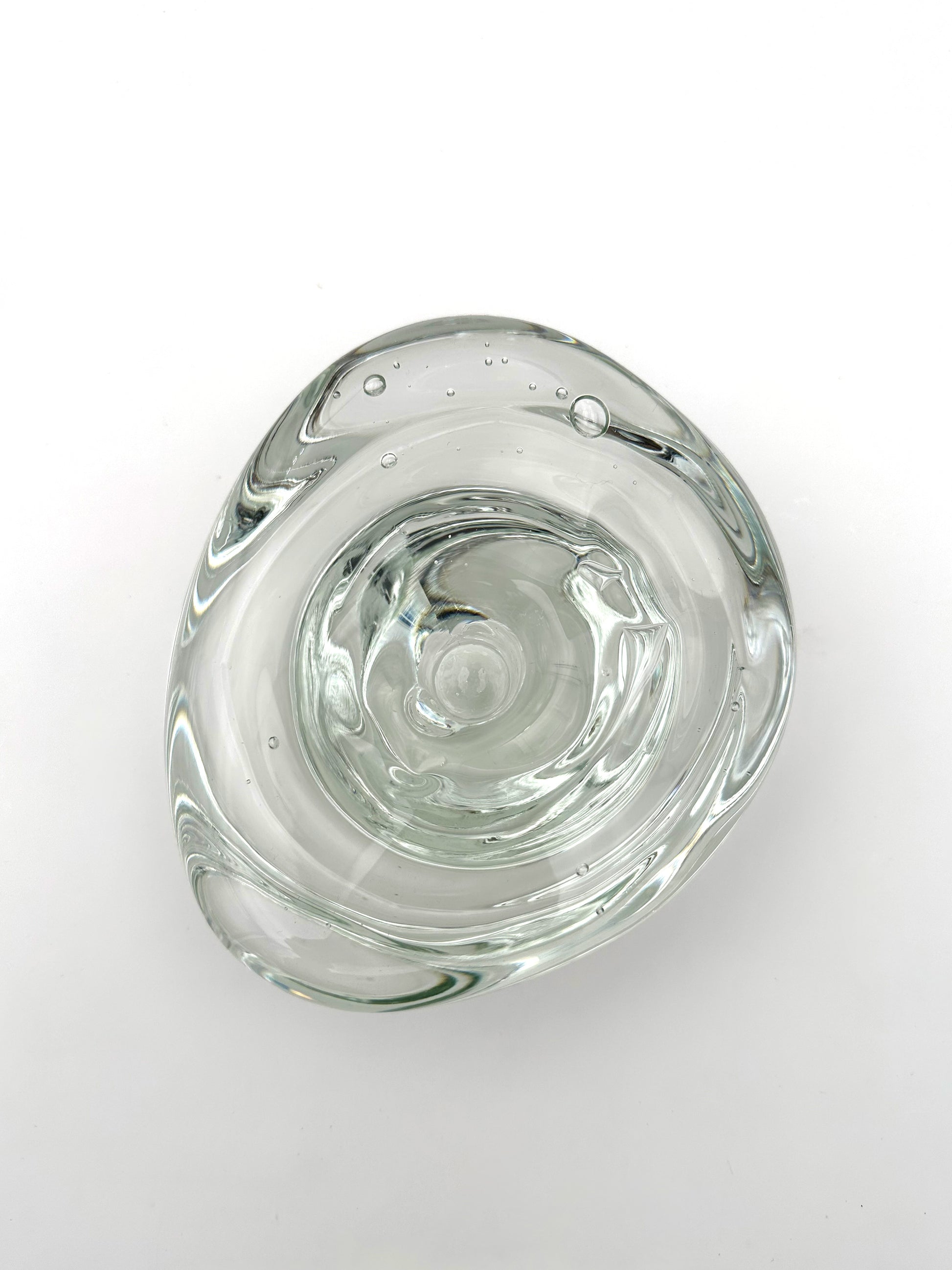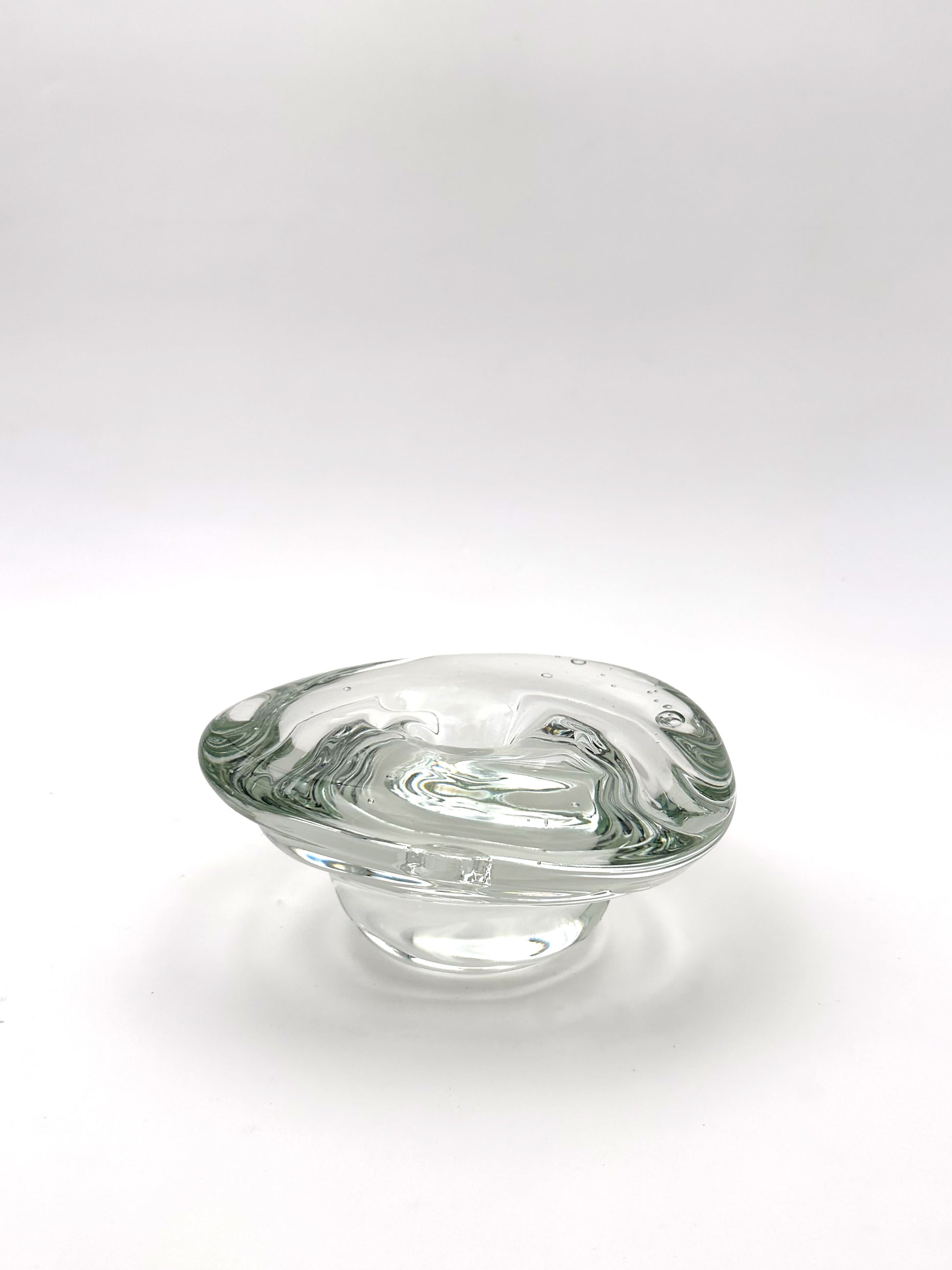 A solid candle holder made by gathering molten glass and shaping it using only gravity and centrifugal force. The solid mass of glass is then indented in the middle to fit a standard taper candle, creating a nature pool that cradles the melted wax, preventing it from dripping on the table. A sculptural accent that harnesses light.